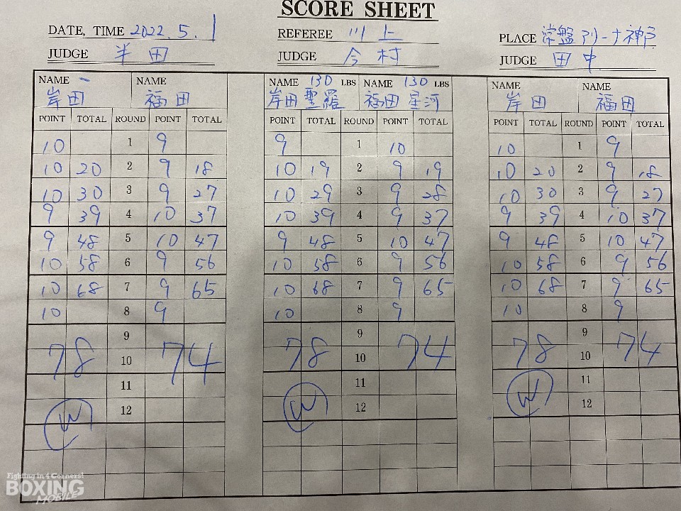 試合後、ベルトを肩にかけた岸田は「勝ててホッとしている。ベルトは重いですね」と笑顔を見せた。「5ラウンドに少し効かされたが、そうなった時の想定もしていたので慌てることはなかった。次のラウンドはもっと前に出てくると思ったので、ボディ攻撃に切り替えた。集中力が切れかけたが、セコンドの指示で立て直すことができた」とターニングポイントとなった6ラウンドの攻防を振り返った。