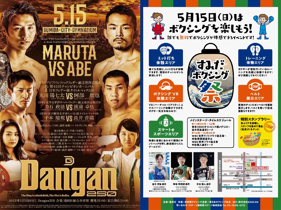 OPBFのスーパーフェザー級王座決定戦「力石政法(27=緑)vs渡邉卓也(33=DANGAN AOKI)」が今週末、15日(日)に墨田区総合体育館で開催される「DANGAN250回記念興行」で行われる。この日、同会場に隣接するサブアリーナでは、墨田区主催の「すみだボクシング祭り2022」(10:00〜16:00)が開かれるが、武居由樹はミット打ち体験に登場することが決まっている。試合の模様は、ABEMA格闘チャンネルでもライブ配信が決まったので、お見逃しなく。