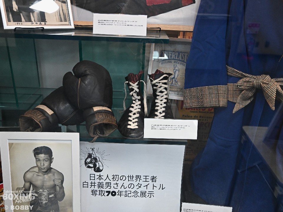 1952年5月19日に故・白井義男がダド・マリノ(米国)に判定勝ちし、日本人初の世界チャンピオンに輝いた日を記念して制定された「ボクシングの日」。今年で70周年を迎え、後楽園ホールロビーには、白井さんが使用したガウンやトランクスなどの記念品が展示された。