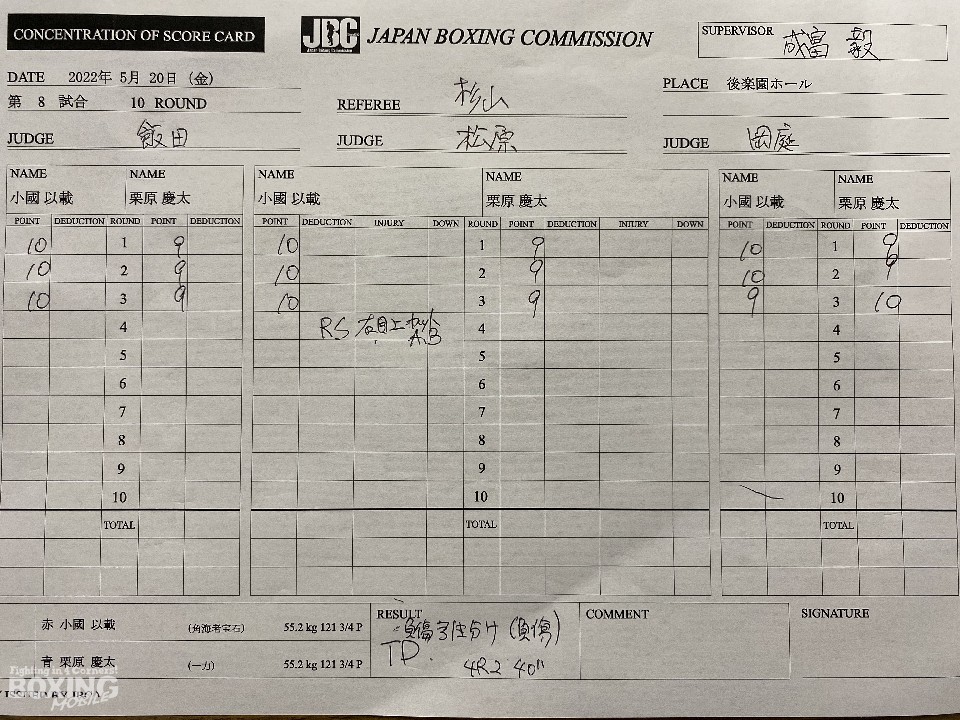 カットした傷に絆創膏を貼りながら会見に臨んだ小國は「復帰戦でこれって(負傷引き分け)僕らしいでしょ。これが実力です」と冗談交じりに言うと、「スタミナも問題なく足もよく動いた。効かされたパンチはなかったが、バランスを崩すくらい栗原選手のパンチは強かった。運を味方にするのもボクシング。また頑張れってことですね」と淡々と語った。