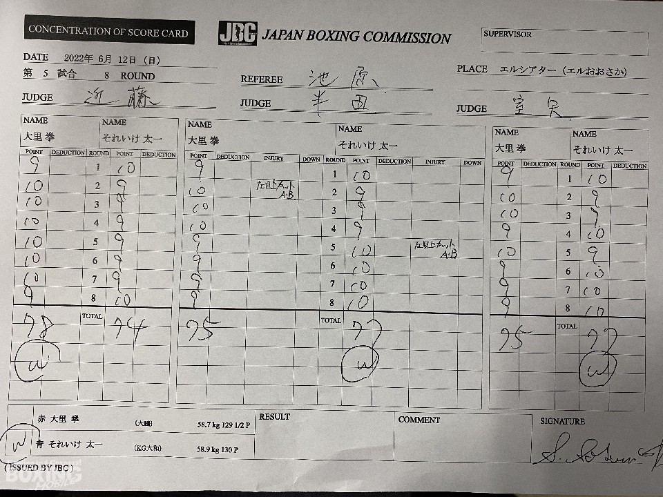 接戦を制した太一が、ランキング復帰を確実とした。初回、太一が右オーバーハンドをヒットし、幸先の良いスタート。2回になると大里は、ジャブからワンツーに繋げて立て直しを図るが、太一も真っ向から応戦。後半は、太一がボディに細かくパンチを集めて攻勢をかけた。ジャッジ2者の支持を得た太一が勝利した。