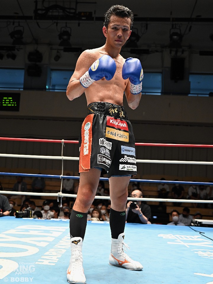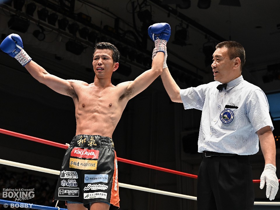 サウスポー同士の一戦は、ガードを固めながら距離を詰めてくる水谷に対し、和氣はジャブからワンツー、さらに左ボディアッパーを決めてペースを掌握。上下に打ち分けダメージを与えるが、水谷の粘りに手を焼き、単発の左を浴びる場面も。それでも着実に攻め立てると、7回に上下のコンビネーションを決め、レフェリーストップに持ち込んだ。