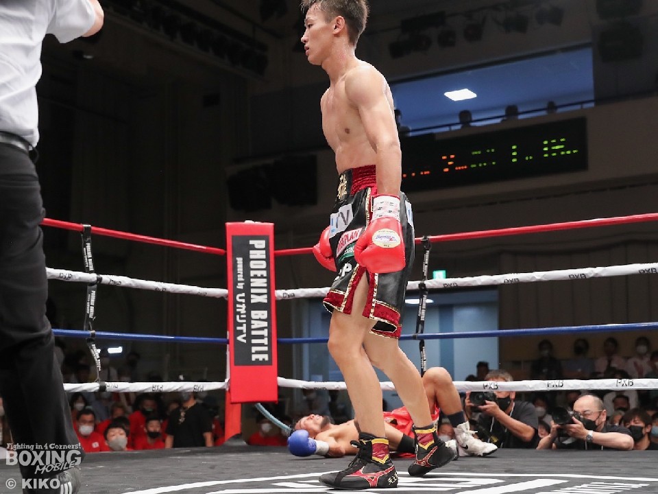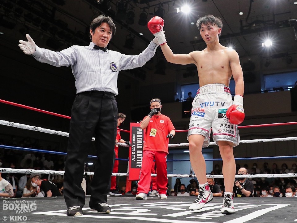 今永が評判通りの強さを見せた。初回からサウスポー今永は、切れ味鋭いジャブから左ストレートをヒット。浜崎の攻撃で距離で外すと、2回に左ストレートでダウンを先取。再開後、右フックで倒して決着をつけた。