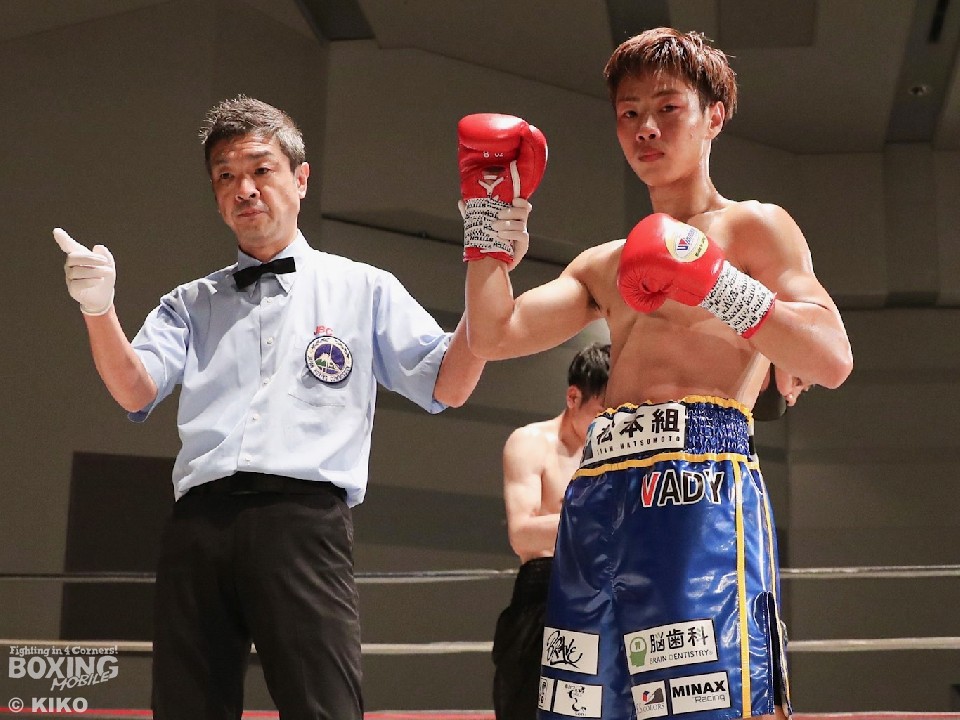 松本が伸びのある右ストレートを決めると、左ボディで痛烈なダウンを演出。再開後、左ボディで豪快に倒した。