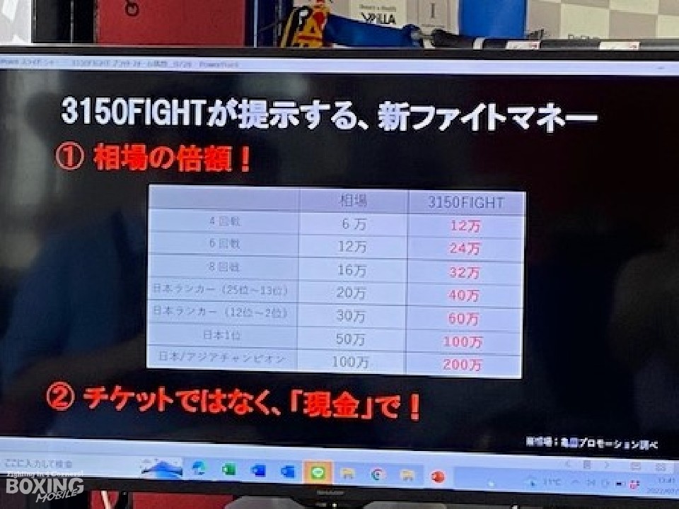 会見の冒頭、亀田ファウンダーは、「現役時代から違和感があった。変えていきたいと思っていた」とボクシングの場合、ファイトマネーは通常チケットでの支払いが多い中、「3150FIGHT」では、現金で払うとし、4回戦から相場の倍額となる。