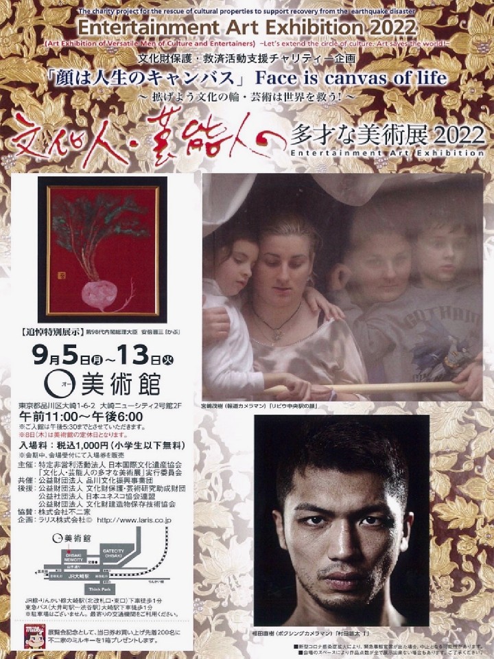 文化財保護・救済活動支援チャリティー企画「文化人・芸能人の多彩な美術展2022」が、8月21日(日)〜29日(月)で埼玉・越谷中央市民会館、9月5日(月)〜13日(火)まで東京・品川「O(オー)美術館で開催される。