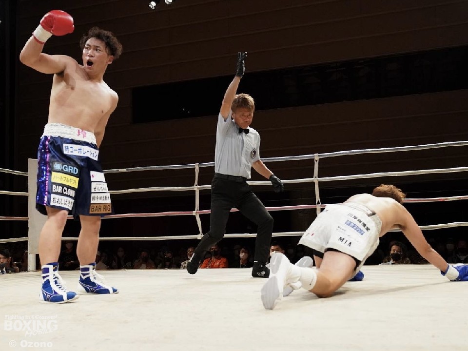 サウスポー仲野が右ボディで先手を奪うと、右フックを振り抜きダウンを演出。2回、上下に打ち分けた仲野は、右フックで2度目のダウンをゲット。前のめりに倒れた上江洲を見て、レフェリーはすぐに試合をストップした。