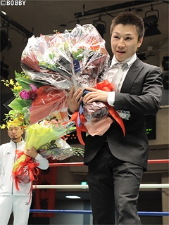 そして師である具志堅会長が送る言葉として「大分でスカウトし、日本タイトル、東洋タイトルと挑戦したが、あと一歩でした。そこが残念でなりません。ですが今後、金田君は競艇選手になるため全力で進んでいきます。これからも金田君を応援して下さい!」と競艇転向をアピールし、新たな挑戦にエールを送った。