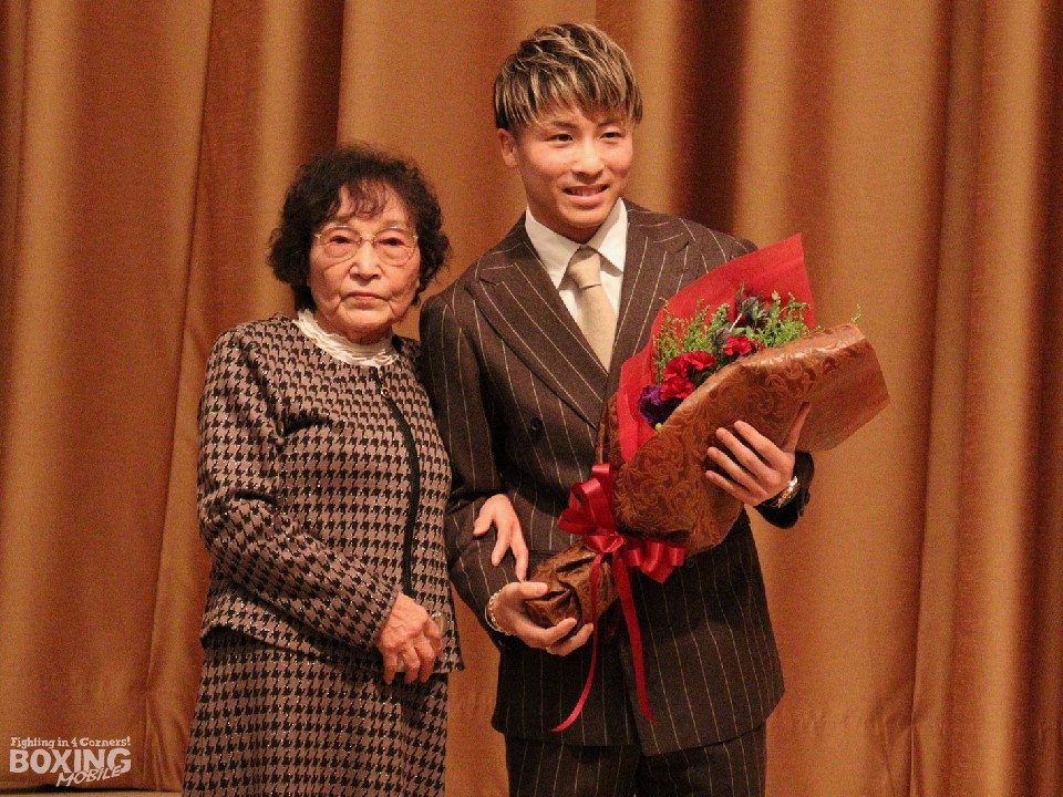 12月13日(火)に、有明アリーナでバンタム級4団体王座統一戦が行われることが発表された井上尚弥(29)に花束が贈られた。プレゼンターを務めたのは、大橋秀行会長の母・ヒサ子さん(87)で、井上は満面の笑みを浮かべた。