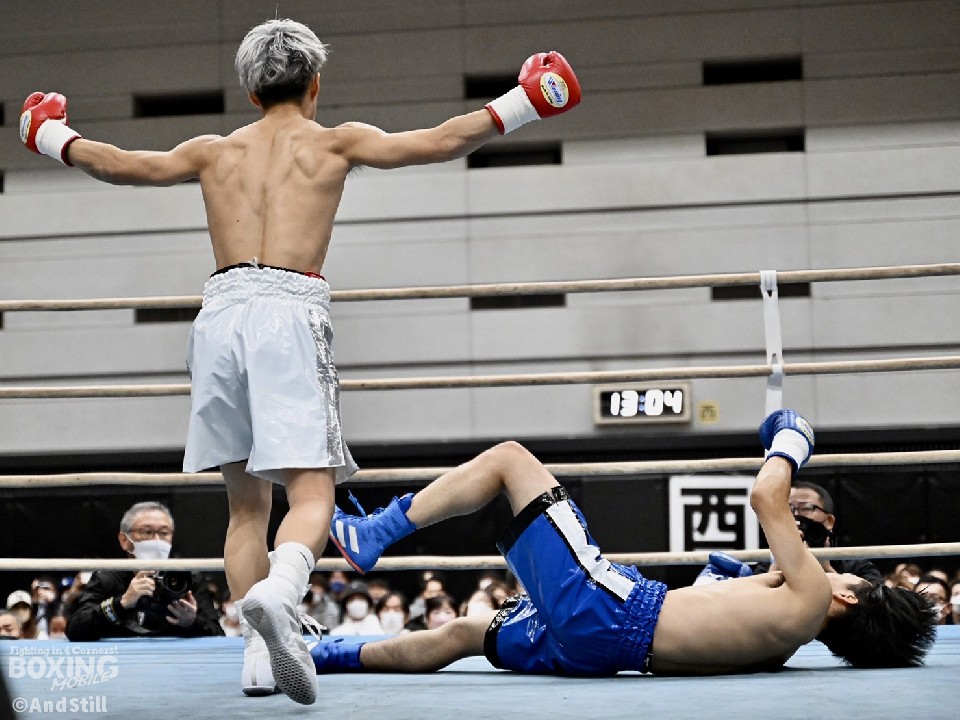 烏頭尾が最初に打ち込んだ右クロスがジャストミート! 尻もちをついた土居はなんとか立ち上がったが、足元がふらつきレフェリーストップとなった。開始後わずか15秒で、烏頭尾が初勝利を挙げた。