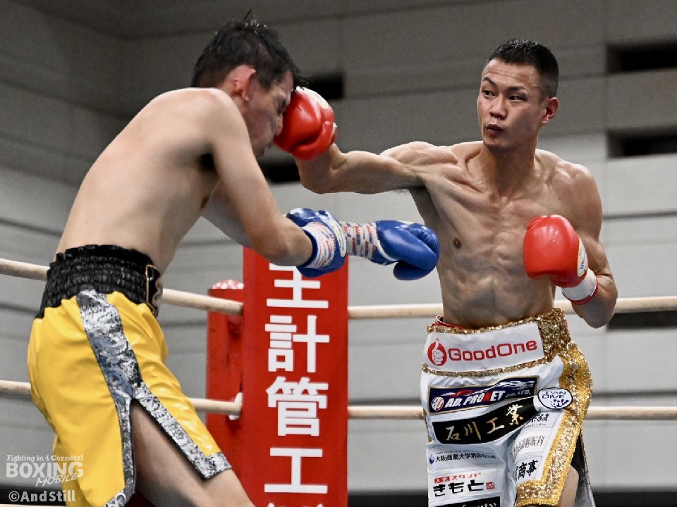 今年でジム創設40周年、100回記念興行のオープニングを飾ったのは、初勝利を目指す烏頭尾一輝(うとお・かずき/19=アポロ)と土居洋舞(18=姫路木下)による、54.5s契約4回戦。会心の一撃で勝負が決まった!