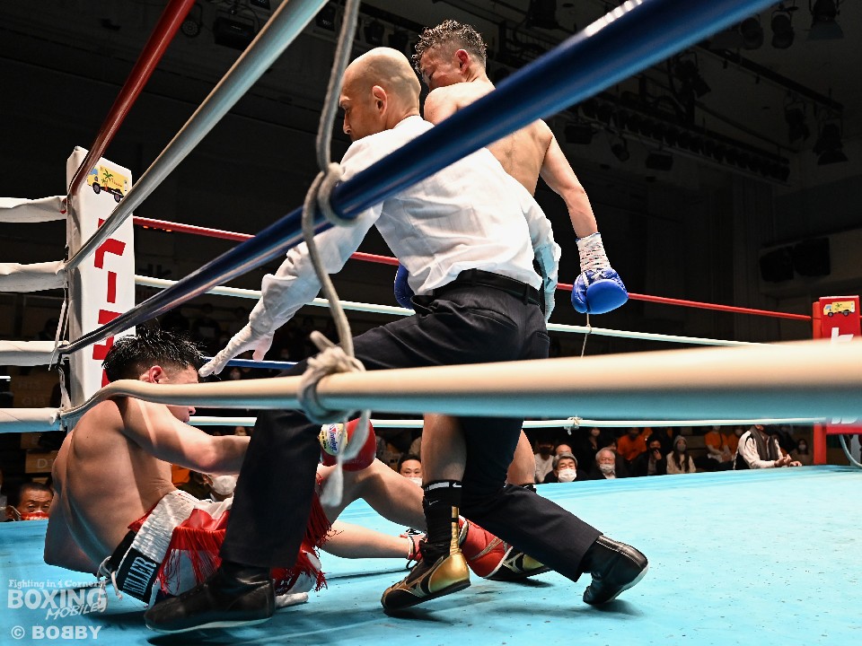 初回、金谷の右ストレートを浴びて、先手を奪われた長谷部だったが、2回以降は打ち合いに持ち込んだ。我慢比べが続いたが、次第に長谷部の左フックが顔面を捉えだすと、6回に連打でダウンを先取。再開後、パンチをまとめてフィニッシュした。