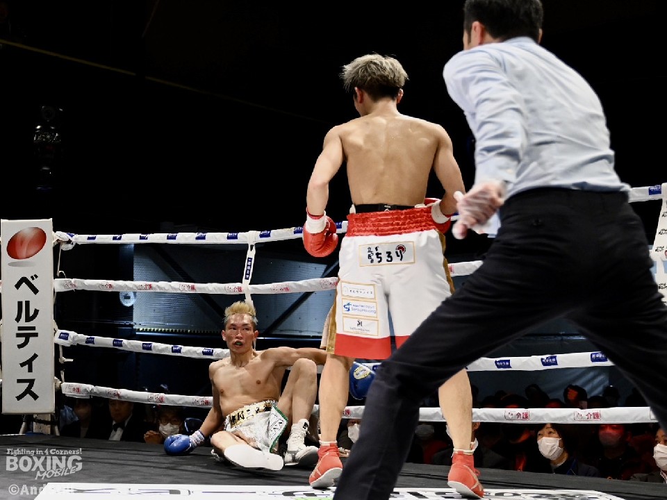 岩アがジャブからワンツーをヒットすると、スピードを活かした攻撃で、ペースを掌握。ラウンド終了間際には、右カウンターでダウンを奪った。右を強振する中村に対し、岩アは左を軸に距離をキープ。3回、岩アは右ストレートで効かせて、追撃の右で2度目のダウンを演出。パンチをまとめて、レフェリーストップに持ち込んだ。