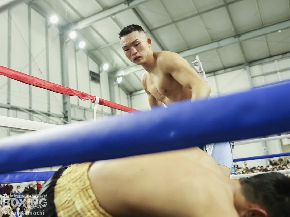 ジャブを突きながら、丁寧な組み立てを見せていた大野だが、3回に打ち下ろしの右ストレートで、痛烈なダウンを演出。前のめりに倒れたジャッカンを見て、レフェリーはノーカウントで試合をストップした。