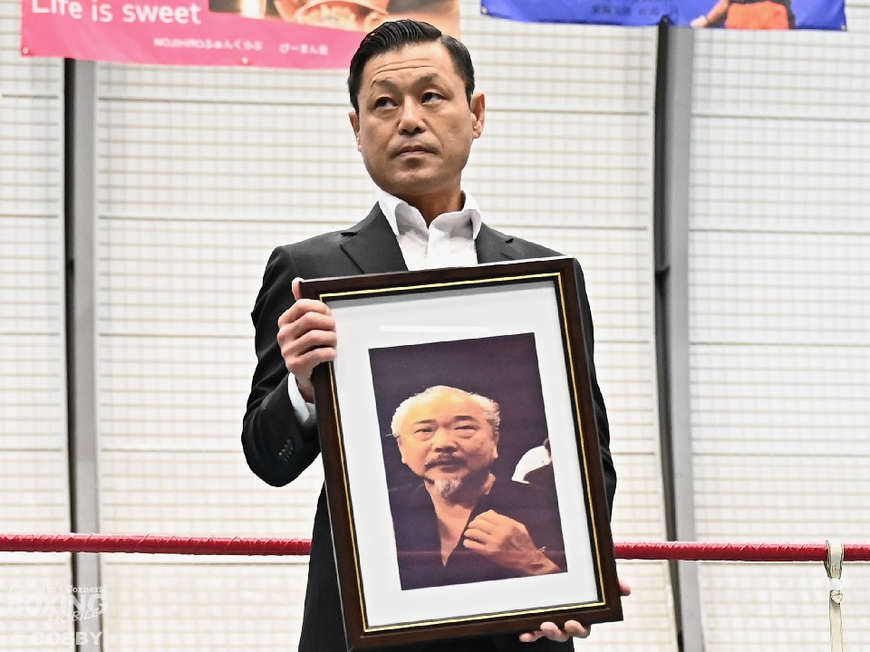 現役時代に指導を受けた薬師寺保栄会長(元WBC世界バンタム級王者)と戸高秀樹会長(元WBA世界スーパーフライ級王者、元WBA世界バンタム級暫定王者)がリング上から故人を偲ぶと、10カウントゴングが打ち鳴らされた。