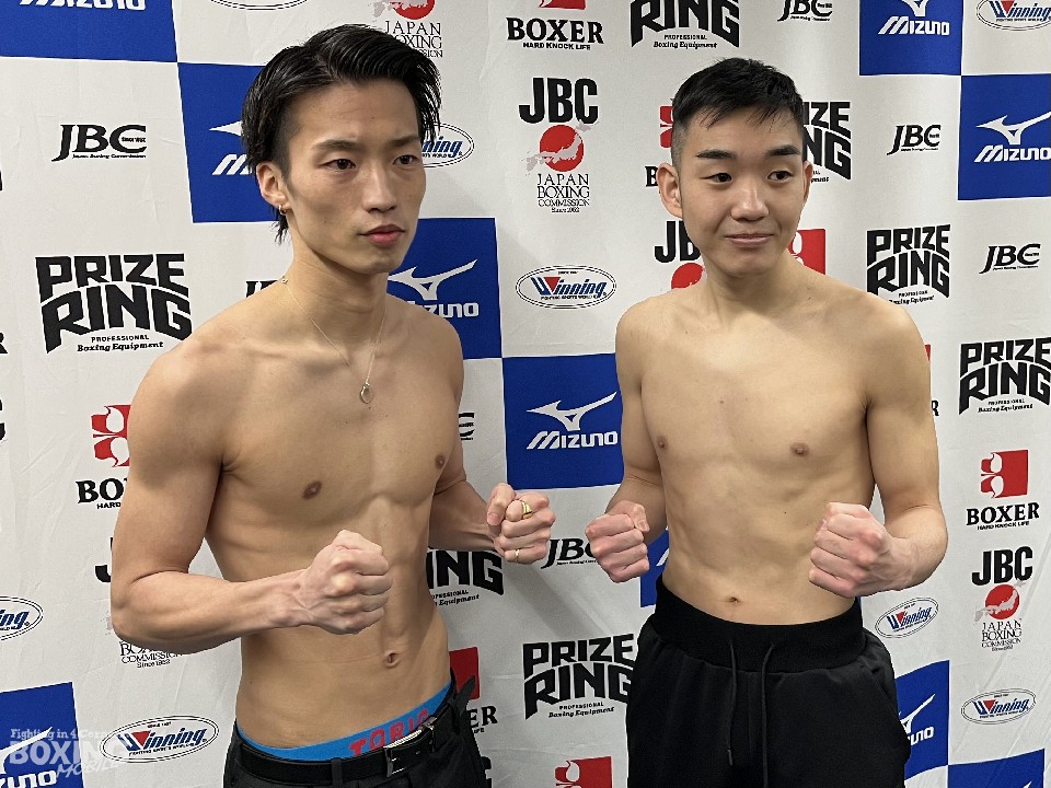 日本フライ級王座決定戦の前日計量が31日、都内のJBC(日本ボクシングコミッション)事務局で行われ、「第1回 WHO'S NEXT DYNAMIC GLOVE on U-NEXT」のメインイベントで対戦する、同級1位の山内涼太(28=角海老宝石)と7位の永田丈晶(25=協栄)が顔を合わせた。