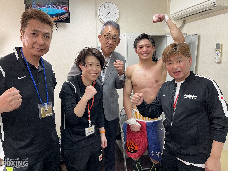 興奮冷め止まぬワタナベジムの控え室では、中川が右頬をアイシングされていた。「3ラウンドがスタートだった」と、序盤に向山のリズムと距離感を測っていたことを明かした。自身もスイッチする練習をしていたというが、向山がスイッチしたことには気づいていなかった。