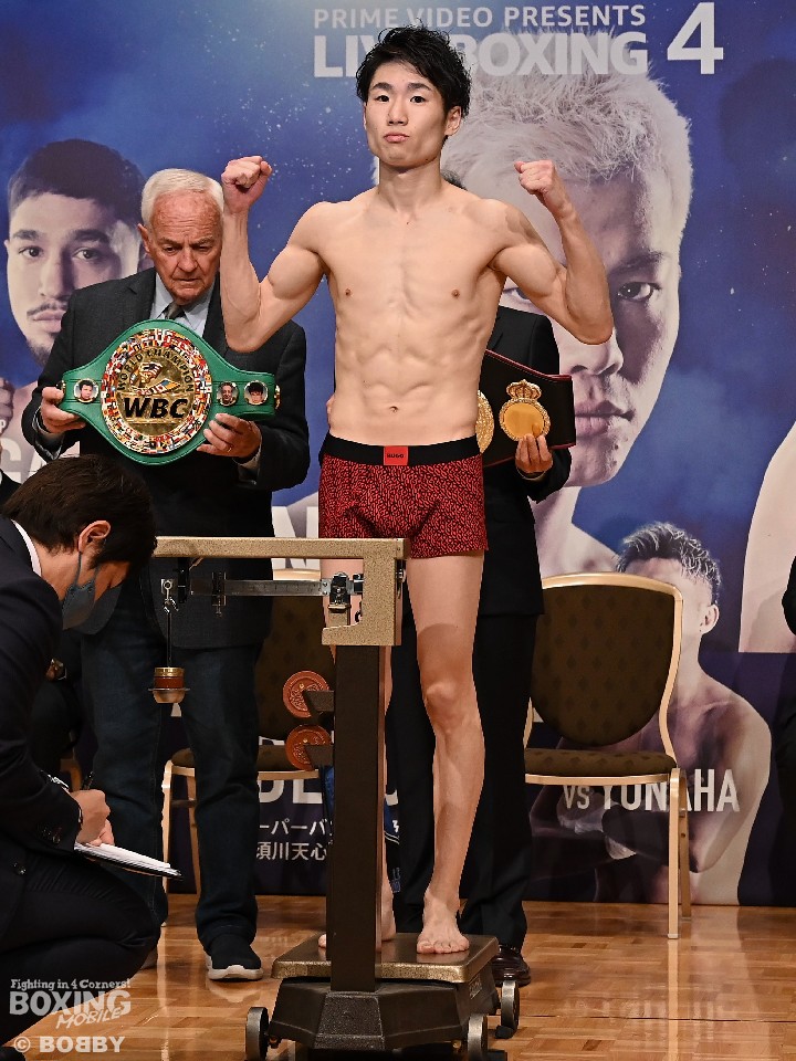 先に秤に乗った拳四朗は、ライトフライ級リミットを300g下回る48.6kgでクリアした。当初は、サウスポーのゴンサレスとの対戦が予定されていたが、相手がマイコプラズマ肺炎に感染したため、急きょオーソドックスのアンソニーとの防衛戦に切り替わった。