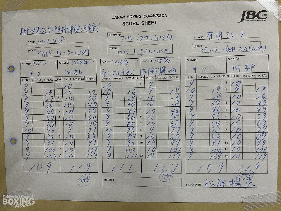 普段通り、胸の前に構える阿部に対して、ガードを固めてプレスをかけるキコ。2回、キコの左アッパーに腰が落ちた阿部は、左ストレートを返してリズムを取り直した。3回にペースを掴んだ阿部は、中盤に入ると足を使って、キコのスタミナを削ると、6回には、阿部の左アッパーを喰らって足が止まったキコを、ロープに追い込んでパンチをまとめた。阿部は7回に右目上をカット。マルチネスのパンチは、まだ生きていた。中盤から使い始めたキコの右ストレートの威力は健在。阿部も中には入りきれず。10回に入ると、両者足を止めて、カウンターを狙いながら体力を温存。最後まで前に出たキコ・マルチネス。左ストレートとフットワークでリズムを作った阿部麗也。勝負はジャッジに委ねられ、判定: 0-3 (117-111,119-109,119-109)で、阿部が勝利を掴んだ。