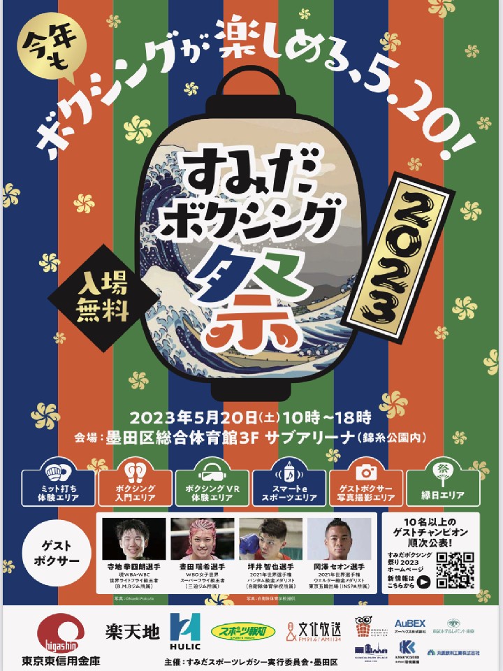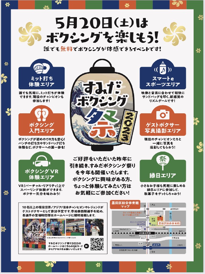 すみだスポーツレガシー実行委員会(墨田区、実行委員長 澁谷哲一)は26日、墨田区と共催で、誰でも参加可能なボクシング無料体験イベント「すみだボクシング祭り 2023」を5月20日(土)に墨田区総合体育館で開催することを発表した。