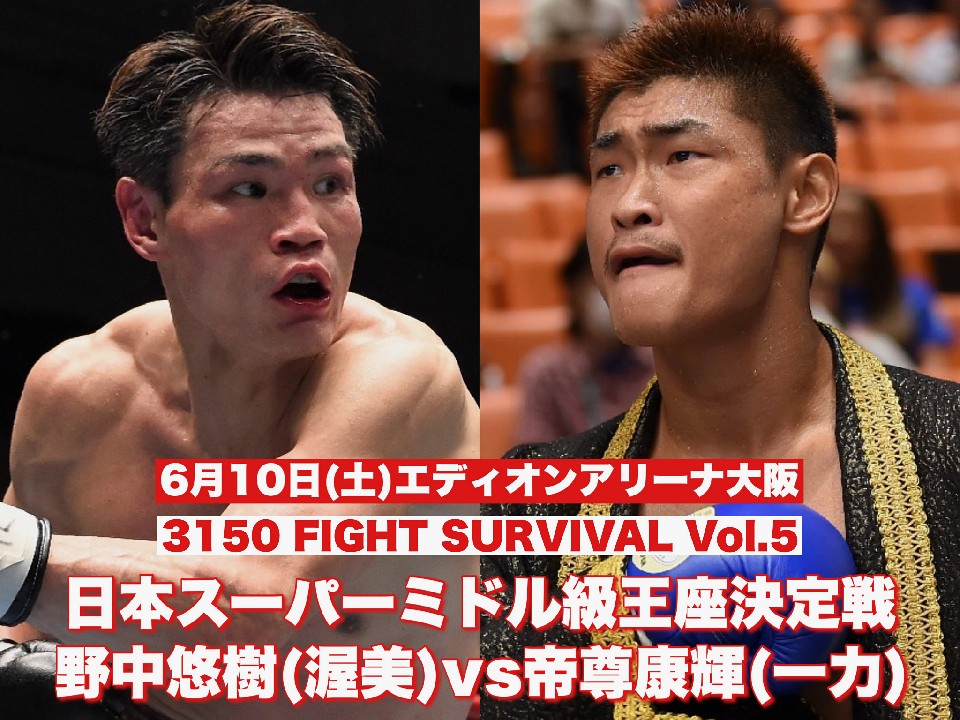日本スーパーミドル級王座決定戦、同級1位の野中悠樹(45=渥美)対同級2位の帝尊康輝(30=一力)が行われる。元WBOアジアパシフィック・ミドル級王者で国内男子最年長の野中が勝てば、自身が持つ国内男子最年長記録(41歳2ヶ月)を更新する。