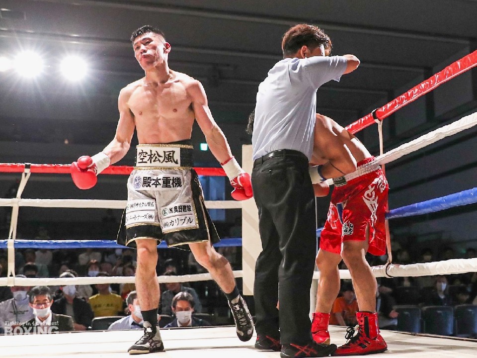 殿本がジャブを上下に散らして、ペースを掌握。2回に右フックを叩きつけてダウンを奪うと、左ボディでダウンを追加。最後はパンチをまとめて、フィニッシュした。
