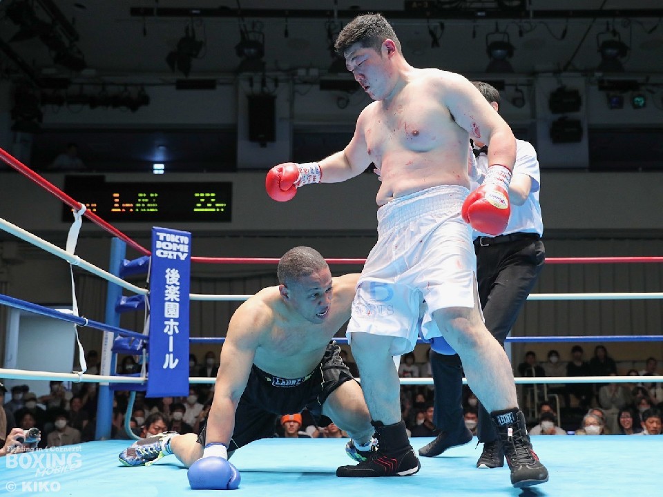 開始早々、ケイが右ロングフックを叩きつけて先手を奪いに行くが、サウスポー佐々木はガードで決定打を避けると、ワンツー右フックでダウンを演出した。2回、ケイはなおもパンチを振り回すが、佐々木は冷静に対応して、左ストレートでキャンバスに沈めた。