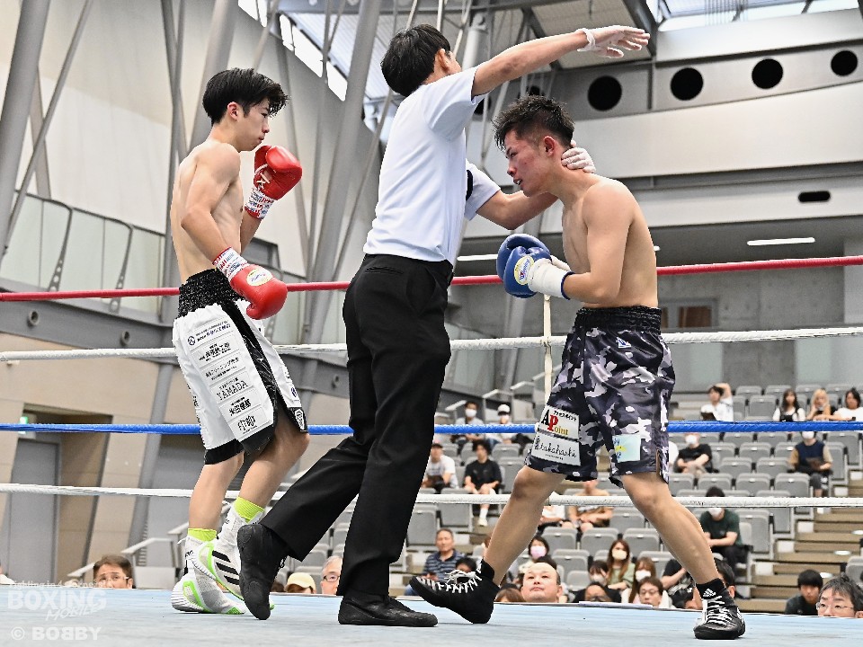 第5試合、中日本スーパーバンタム級4回戦では、武藤涼太(18=松田)と高橋梨久(18=トコナメ)が激突。サウスポー同士による一戦は、武藤が左ストレートでガクッと腰を沈めさせると、追撃の左でダウンを先取。2回、的確なコンビネーションで、レフェリーストップに持ち込んだ。