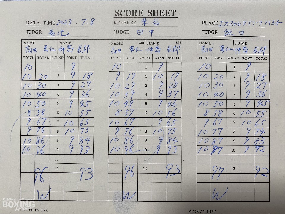 序盤は、高田がプレスをかけて左ボディ、右ストレートを好打し、ペースを掌握。積極的な攻撃で、ポイントを重ねた。前半終了時の公開採点は、49-46×1、50-45×2で高田がリード。劣勢の仲島だが6回に右ストレートを決めて、ダウンを演出。立ちあがった高田はゴングに救われた。しかし、高田は立て直しを図ると、最終10回はワンツー、左フックでグラつかせて、勝利を決定づけた。