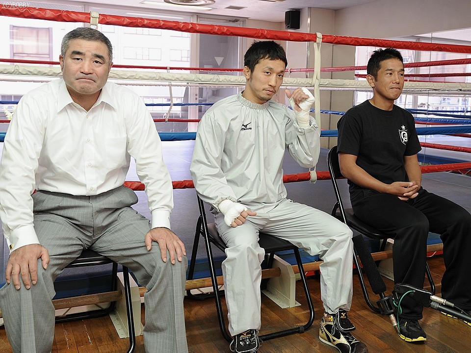13時スタートの公開練習ではあったが、粟生はバンテージを念入りに巻き、しっかりとアップを済ませ、帝拳ジム・浜田剛史代表と田中繊大トレーナーを伴い記者会見に臨んだ。