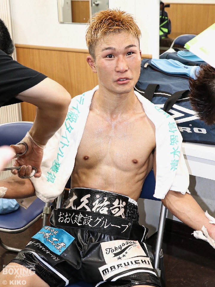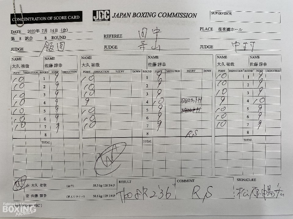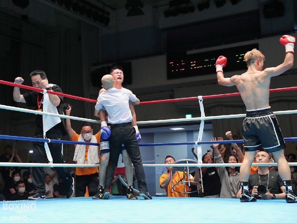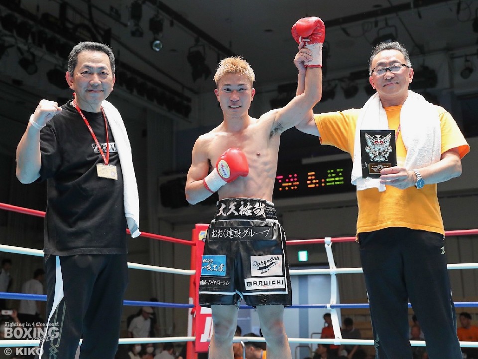 序盤は、大久がジャブからワンツー、左フックを好打しペースを掌握。着実にポイントを重ねた。右カウンターを狙った佐藤だが、決定打を奪えず。しかし、4回にボディにパンチを集めると右ストレートで顔を弾いた。やや手数が減った大久だが、5回に左ボディ、左フックを決めて息を吹き返すと、最終8回に右ストレートから連打で、レフェリーストップ勝ちした。