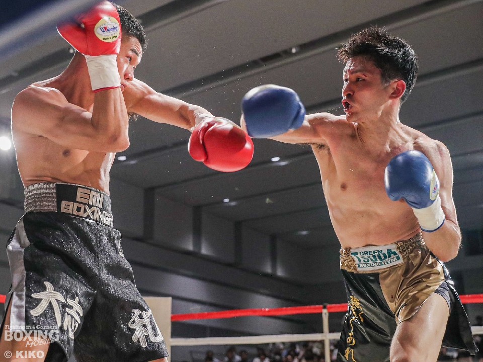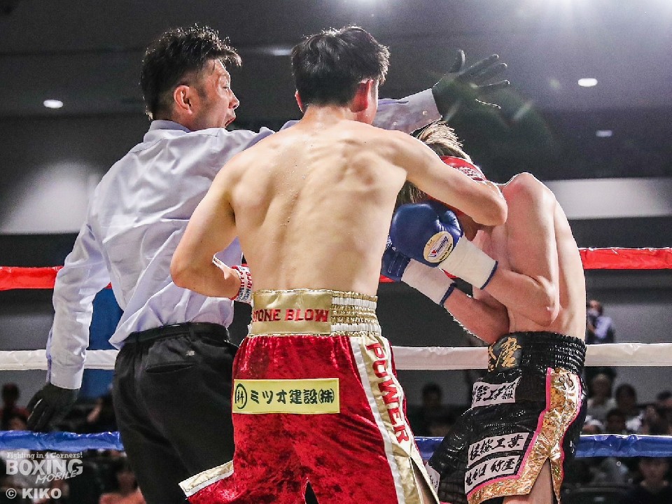 開始から眞木が距離を潰して、左ボディからの豊富な手数で先手を奪うことに成功。長身の大谷は右ストレート、左ボディを返すが、眞木はフィジカルの強さを活かし、ペースを譲らず。2回、眞木はロープに押し込んで、上下のコンビネーションを浴びせると、レフェリーが試合をストップした。