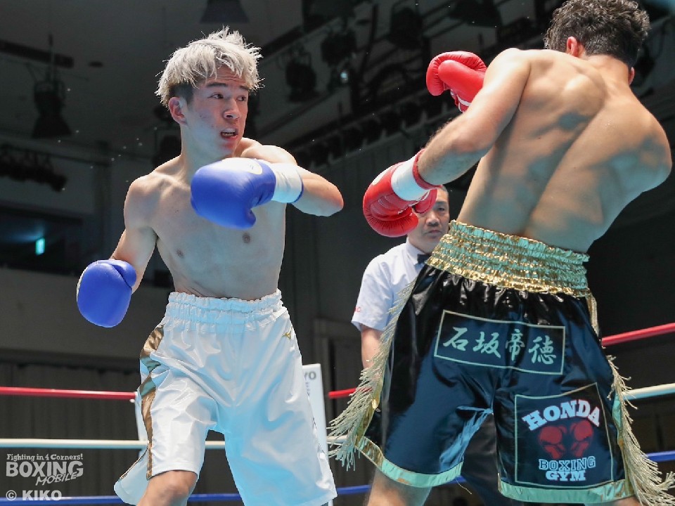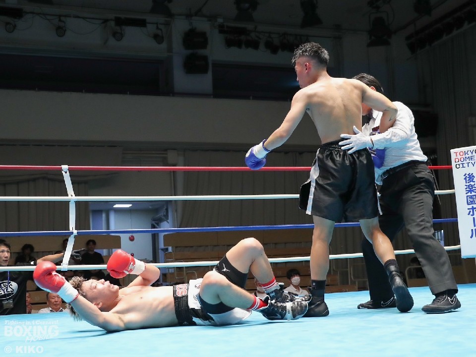 第6試合、スーパーバンタム級4回戦では、池崎創哉(24=三迫)と鳥井士恩(22=角海老宝石)が激突。試合は、ダウン応酬の大激戦となった。