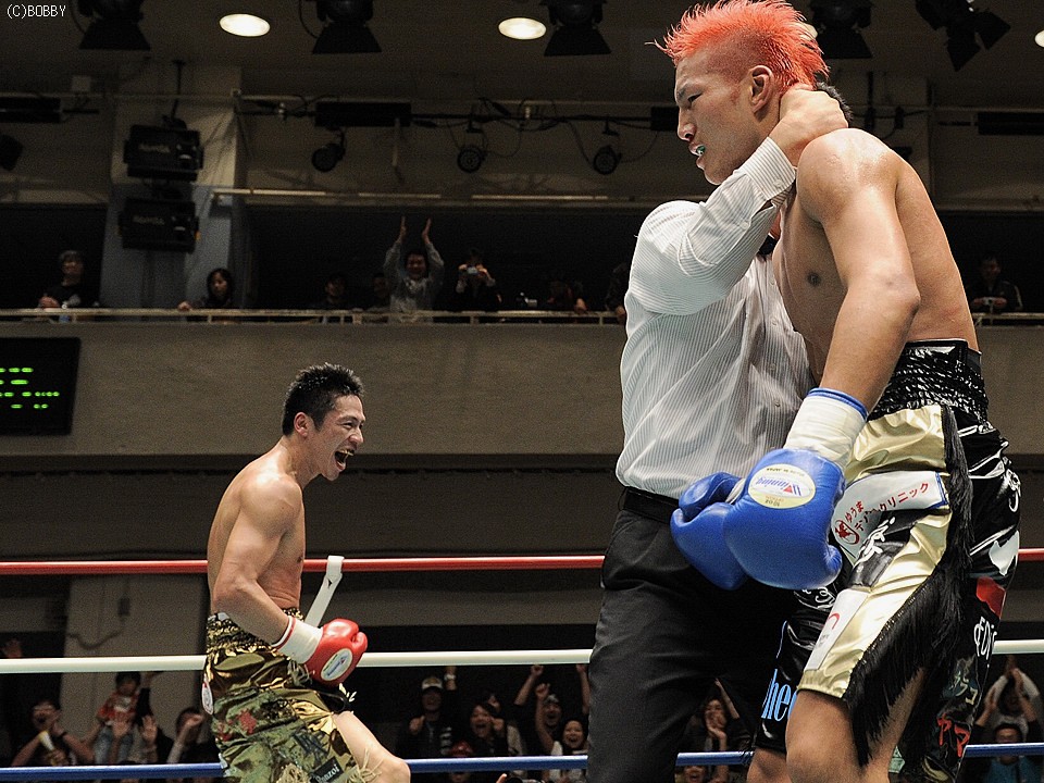 そして3ラウンド、湯場は右フック・左ストレートでダウンを奪うと、立ち上がる胡に強烈な左ストレートを浴びせ両膝を揺らし、追い撃ちのワンツーでレフェリーストップを呼び込み、復帰戦を完勝といえる内容で飾ってみせた。