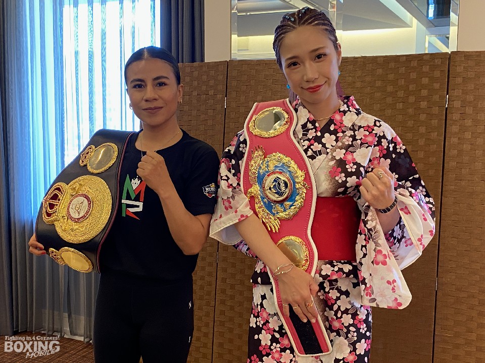 WBA(世界ボクシング協会)・WBO(世界ボクシング機構)アトム級王座統一戦の前日計量と調印式が4日、神戸市内のホテルで行われ、WBA王者のモンセラット・アラルコン(29=メキシコ)とWBO王者の黒木優子(32=真正)が対峙した。