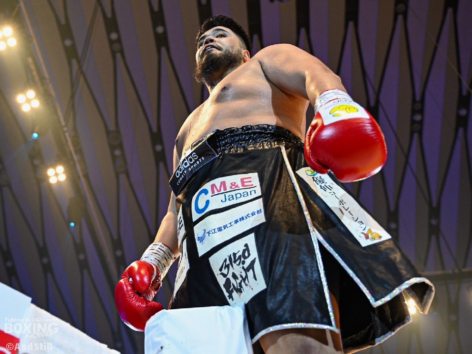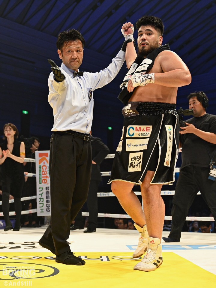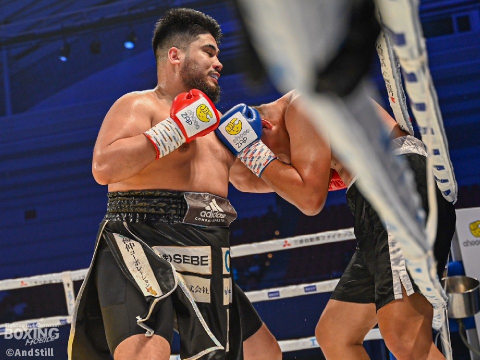 日本ヘビー級王者が、8戦目のリングで貫禄勝利。但馬がプレスをかけて左ボディを突き刺すと、サウスポーのナコンチャイの返しのパンチにも冷静に対応。連打から右をフォローしてダウンを演出。再開後、ジリジリと距離を詰めて、右アッパーから左ボディで倒すと、最後はパンチをまとめてレフェリーストップに持ち込んだ。但馬が3試合ぶりにKO勝ちした。
