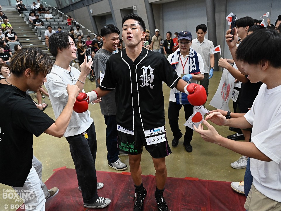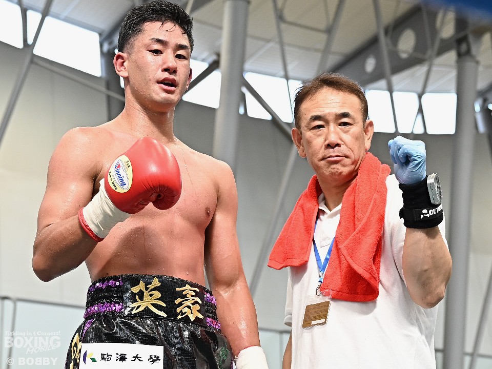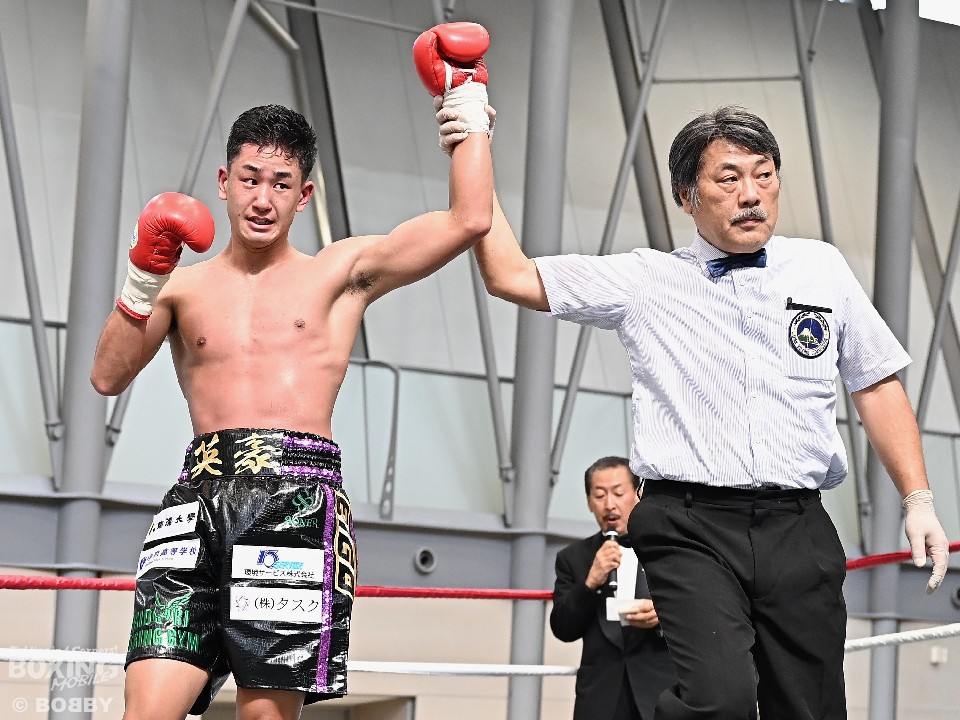 初回、英豪はジャブから左ボディにつなげると、左フックでダウンを演出。絶好のスタートを切った。2回以降も、英豪は右クロス、左ボディを好打しペースを維持。しかし、浜崎も懸命に右を合わせて意地を見せた。6回、英豪は右ストレートでグラつかせると、パンチをまとめてフィニッシュした。