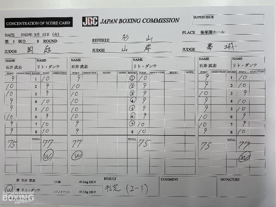 石井がプレスをかけて、左ボディを叩くが、ダンテはガードでブロックすると、右カウンター、右アッパーを好打。ダンテが老獪さを見せて、ジャッジに攻勢をアピール。しかし、石井は気持ちを切らさず、徹底的に左ボディに狙いを定めると、ダンテは失速。グイグイと攻め立てた。最終8回、ダンテはスタミナの消耗が激しい石井に右フックをヒットし、明確にポイントを奪った。採点は割れたが、ダンテに軍配が上がった。