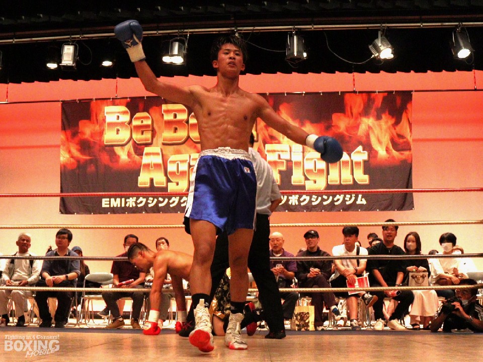 第5試合、60.0kg契約4回戦では、奄美隼人(37=江見)と中原博斗(19=倉敷守安)が激突。変則的な左アッパーを打ち込む奄美に対し、中原はジャブから組み立てると右ボディストレート、ワンツーを好打。3回に右ボディでダウンを奪った。4回、中原はボディにパンチを集めてダウンを追加すると、連打で試合を終わらせた。