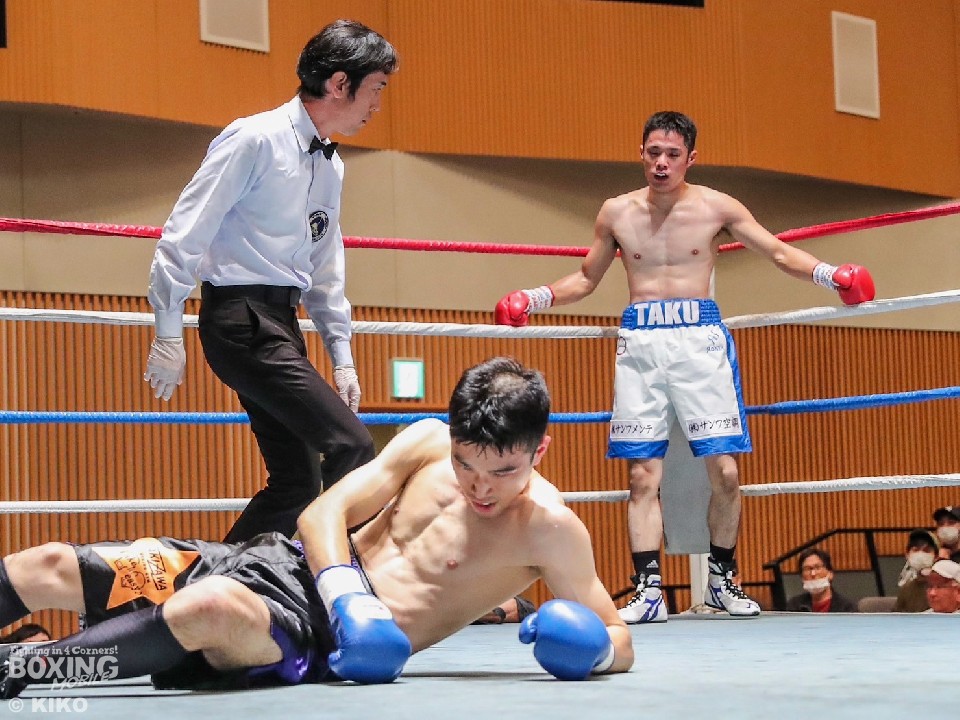 第2試合スーパーフェザー級4回戦では、ハンマータク(26=岐阜ヨコゼキ)と森啓介(29=タキザワ)が拳を交えた。ハンマーが独特のタイミングで相手の懐に入ると、左フックでダウンを演出。レフェリーストップ勝ちした。