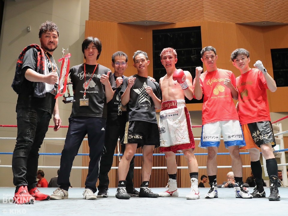 横関孝志会長(写真:左)は「疲れるけど、良い充実感ですね。ボクシングの素晴らしさが伝わったと思う」と自主興行を総括すると、「佐伯は不用意なパンチをもらったが、地元でプレッシャーがかかる中、よくやってくれた。合格点を与えてもいいと思う」とジム頭の活躍に目を細めた。