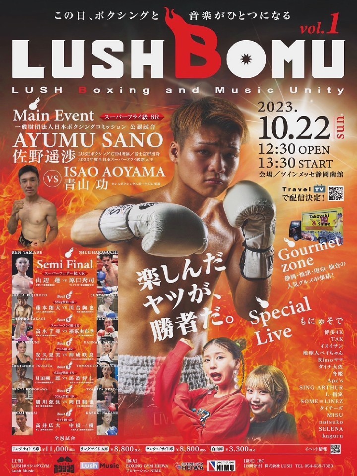 試合は、明日(22日)、ツインメッセ静岡南館で開催される「LUSH BOMU」のメインイベント、スーパーフライ級8回戦で行われる。試合の模様は、動画配信サービス「TravelTV」で全試合ライブ配信される。