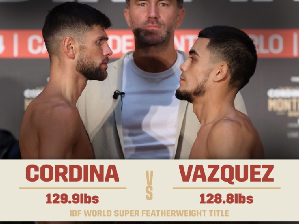 モナコ・モンテカルロで4日(日本時間5日)、マッチルーム・ボクシングがW世界タイトル戦を開催。メインイベントでIBF(国際ボクシング連盟)スーパーフェザー級王者ジョー・コルディーナ(31=英)が、同級9位エドワード・バスケス(28=米)と前日計量を迎えた。