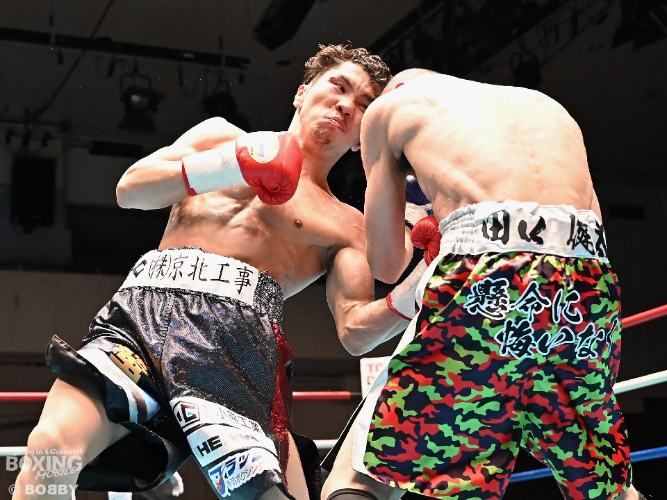 天海が、ジャブで下がらせるとプレスをかけて、左ボディでダウンを演出。勝負が決まったのは2回。アッパーを織り交ぜた攻撃で攻め立て左ボディ、右フックで立て続けに倒して、フィニッシュした。