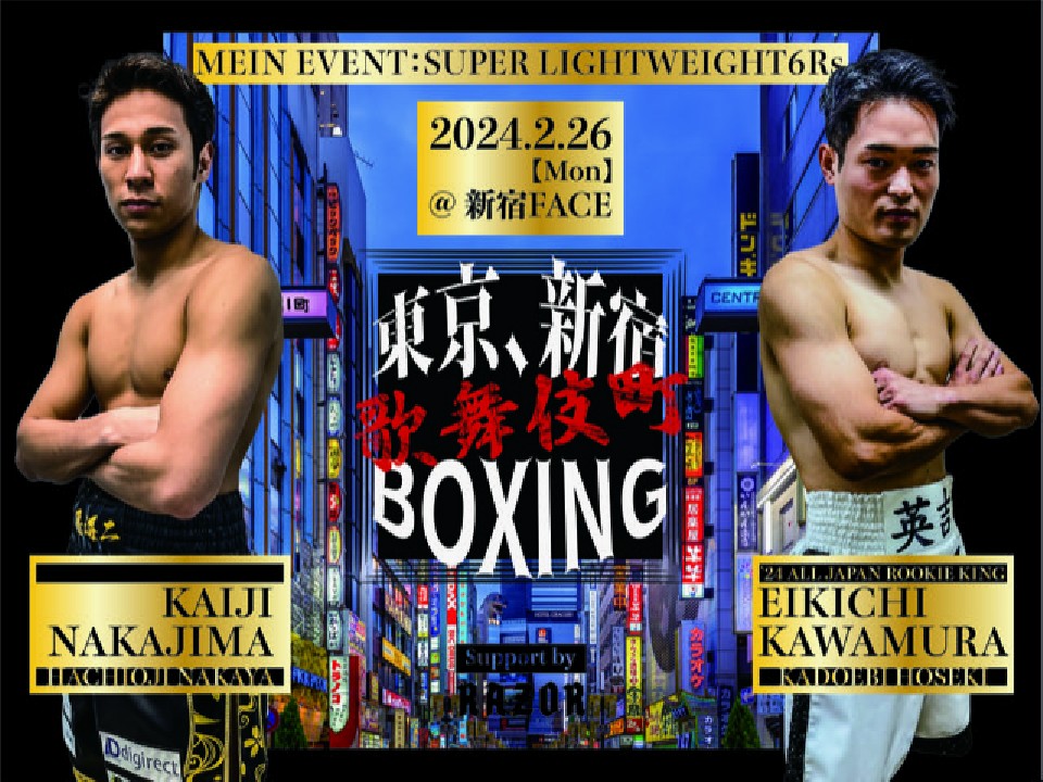 2月26日(月)に新宿FACEで開催される八王子中屋ボクシングジム主催の『東京、新宿 歌舞伎町 BOXING』のチケットが、試合1ヶ月前に完売となった。メインイベントは、スーパーライト級6回戦で、昨年度全日本新人王の川村英吉(24=角海老宝石)に、中島海二(21=八王子中屋)が挑む全勝対決がセットされた。当日は、会場内に「DJブース」を設けるなど、新たな試みも楽しみだ。