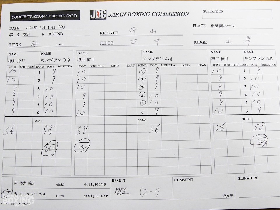 初回は樽井が、機動力を活かしたボクシングで先制。2回は、モンブランがプレスをかけてワンツーで反撃。その後は、樽井がリズム感のある攻撃を見せるが、モンブランも手数を増やして対抗。終盤は、モンブランは回転力を活かした連打で押し切った。採点は割れたが、モンブランに軍配が上がった。