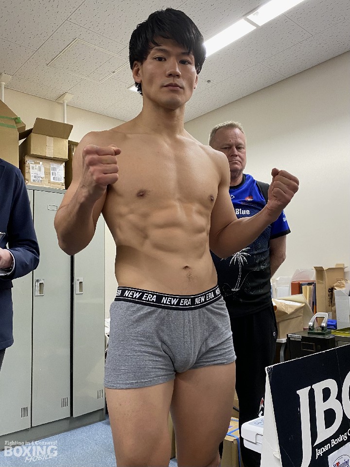 先に秤に乗った井上は、100gアンダーの69.7kgでクリアした。OPBF王座は初防衛戦、WBO-AP王座は3度目の防衛戦となる井上は「コンディションはバッチリ。明日は、生き残りをかけた試合。勝った方が今後、世界上位ランカーと戦える一戦」と、スーパーウェルター級アジア頂上決戦だと位置づけた。