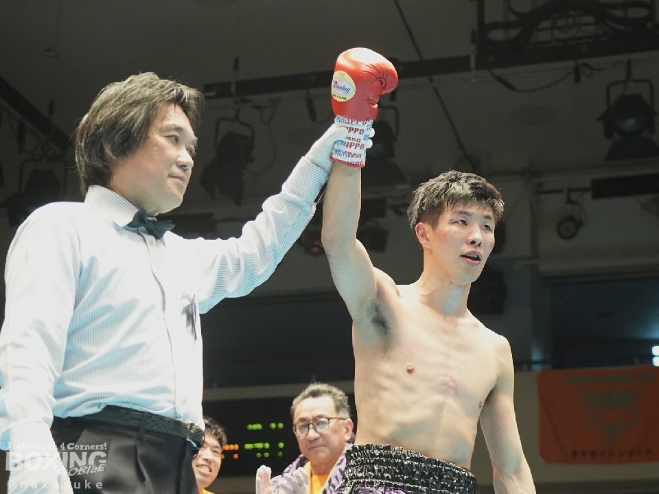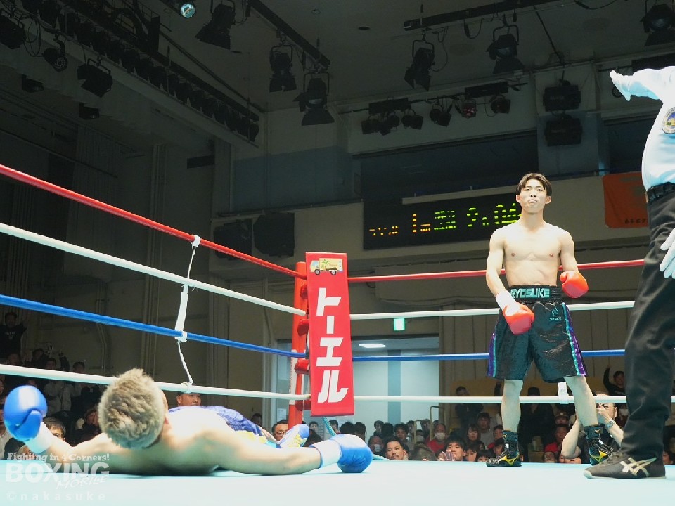 第6試合56.5kg契約6回戦では、小山涼介(23=金子)と新屋叶多(28=全日本パブリック)が激突。アマチュア39戦23勝(4RSC)16敗を経て、プロデビュー戦に臨んだ小山が、タイミング抜群の右ストレートで倒し、開始57秒で決着をつけた。