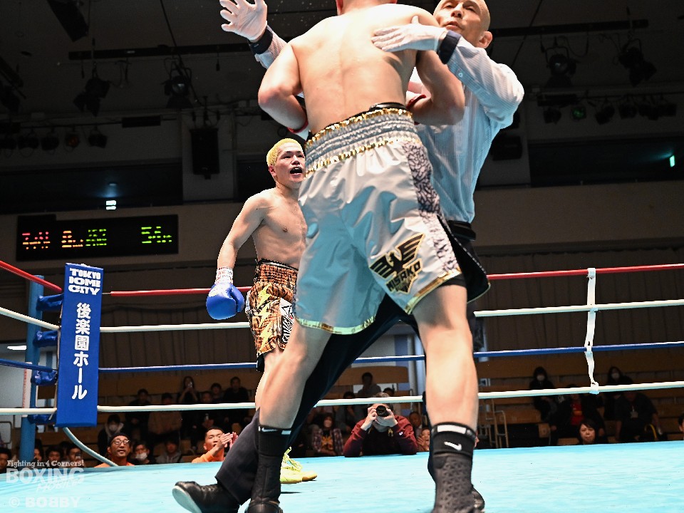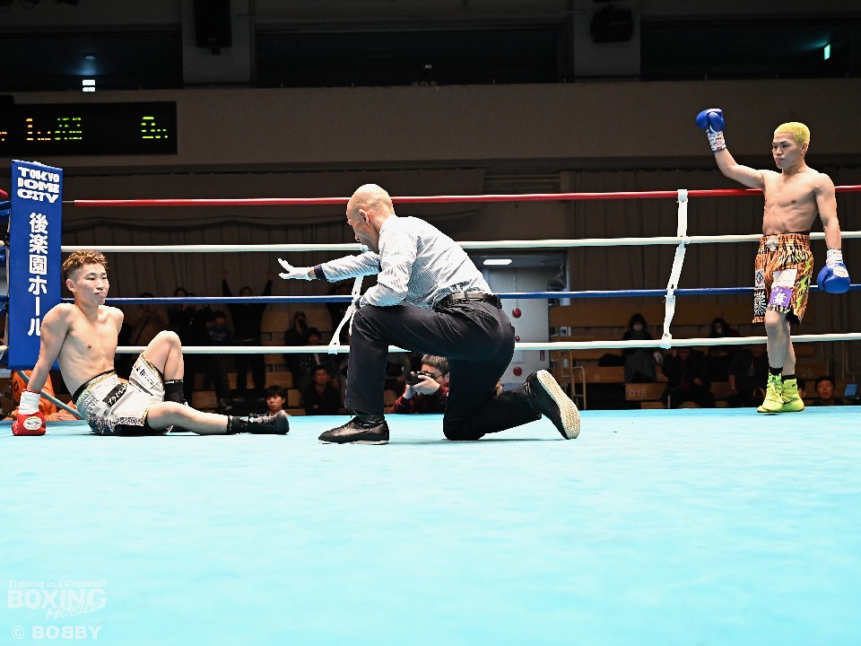 試合は初回に動いた。ジャブを突いて丁寧にプレスをかけた長谷部に対して、初回終了のゴングと同時に、岡田の左ストレートがジャストミート。顔面に喰らった長谷部がまさかのダウン。2回以降も長谷部が距離を詰めてリズムを取り直したが、要所で左ストレートを顔面に打ち込んだ岡田が、最終回に顔面を叩いたところで、レフェリーが試合を止めた。