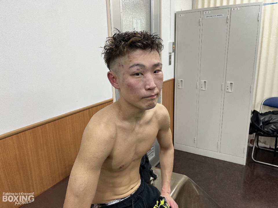 記者の質問に「相手のパンチを見て、自分だけ打つ」と考えて試合に臨んだことを明かした。ダウンを奪った左ストレートは、山田武士トレーナー直伝の伝家の宝刀。「潜り込んで打った」と笑顔が弾けた。